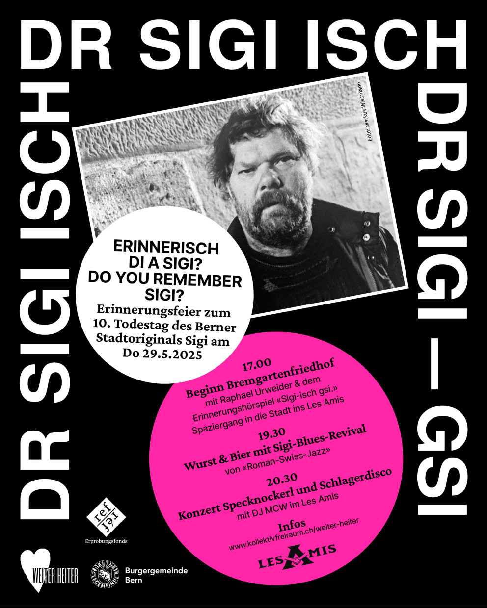 Zum 10. Todestag von Sigi - dem weit um bekannten Berner Stadtoriginal, ist ein eigens für den Anlass entwickeltes Erinnerungshörspiel entstanden: „Dr Sigi – isch gsi.“ Es versammelt persönliche Erinnerungen an Sigi und macht erlebbar, wie kraftvoll gelebte Erinnerung sein kann – gerade wenn sie gemeinsam geschieht. Denn Sigi war weit mehr als nur ein Berner Urgesteint: Er war auch Nachbar, Freund, Musiker, Vater und nicht zuletzt ein Teil der Stadtgeschichte, sichtbar und zum Ende doch oft allein.
