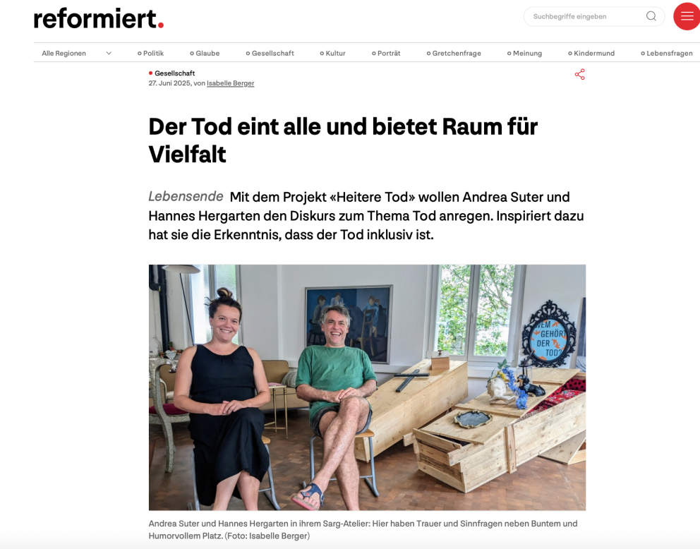 Wir danken Isabelle von reformiert. herzlich für den einfühlsamen Artikel, der unser Wirken mit dem Projekt Heitere Tod vorstellt. Reformiert. ist die Zeitung der evangelisch‑reformierten Landeskirchen in der Deutschschweiz. Jede Ausgabe bietet anregenden Lesestoff zu Themen rund um Gesellschaft und Kirche, Religion und Spiritualität, Politik und Kultur.