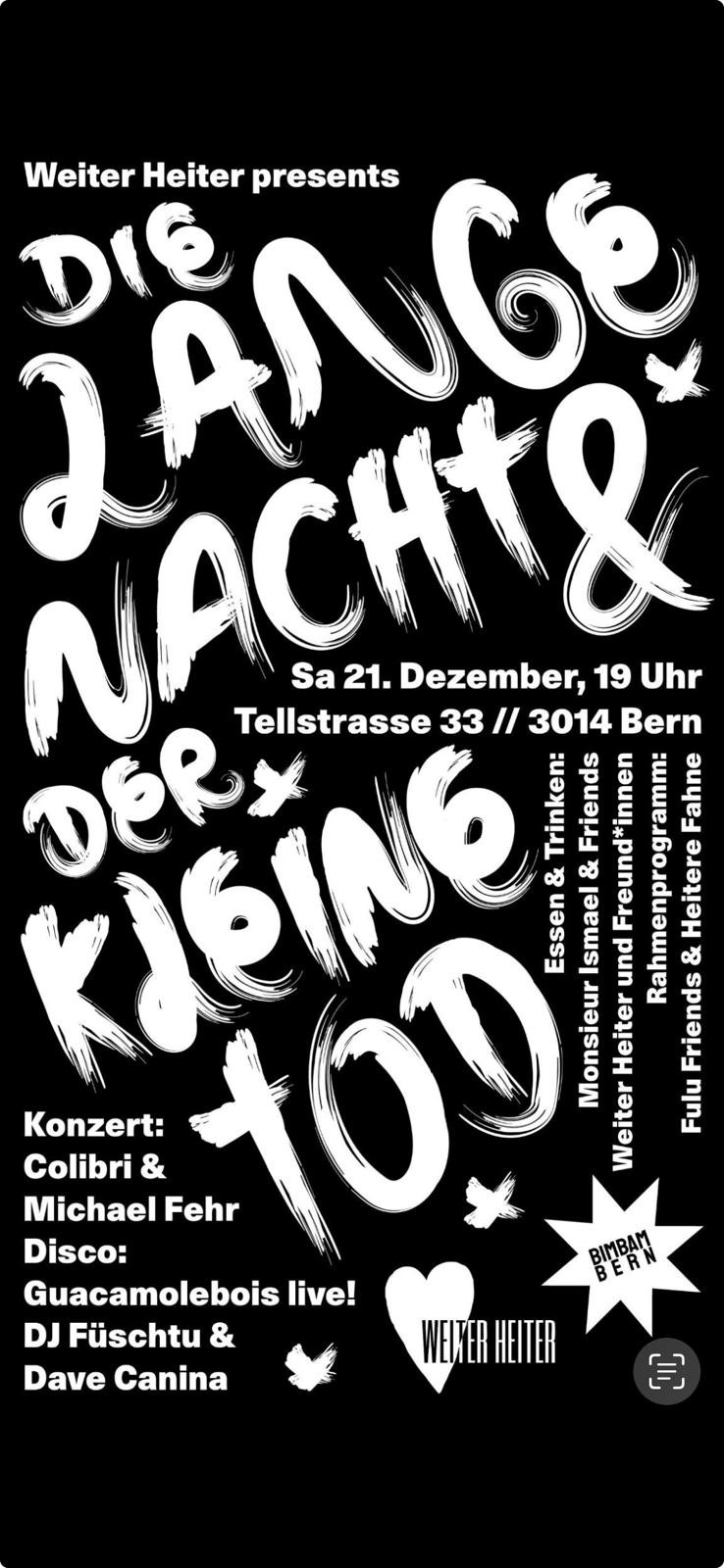 Für eine lange Nacht versuchen wir die Markuskirche zum Tanz zu erwecken. Mit leidenschaftlichen Klängen in der Kirche von Colibri, feinfühliger Poesie des Sprachkünstlers Michael Fehr, freudigem Klamauk der Fulu Friends, groovigen Techno mit den Guacamolebois aus Basel und den Beats von DJ Füschtu & Dave Canina. Mit dabei die Freund*innen aus heiterem Haus: Leila, Jerry und DJ Stechloff bereichern den Abend mit Gesang und Sounds. Dazu Speis und Trank von Monsieur Ismael & Friends.…und der kleine Tod - der versteckt sich doch überall - ihr dürft also gespannt sein!