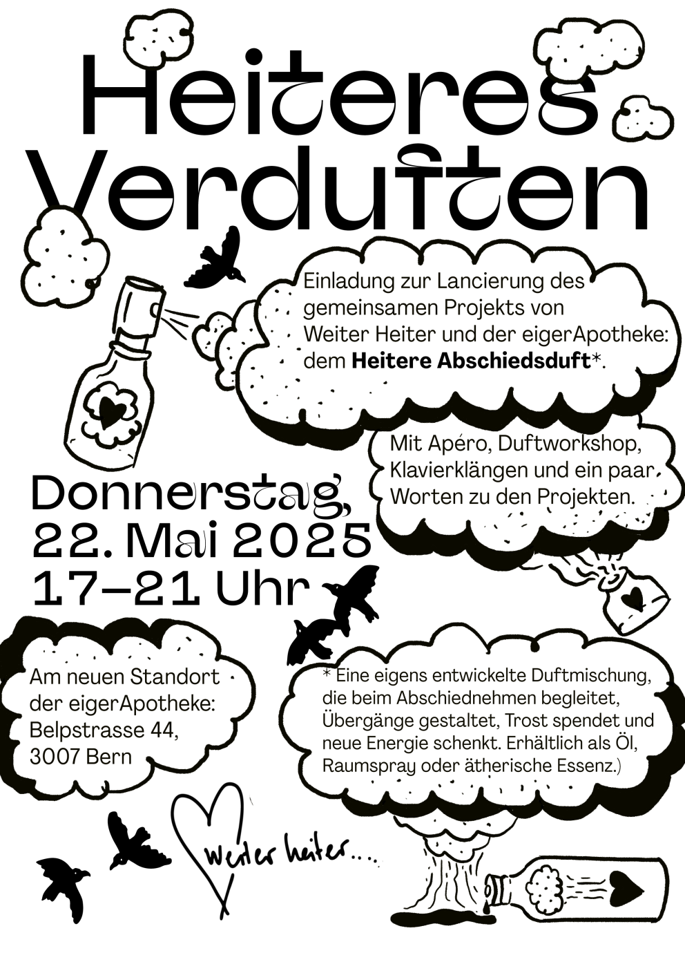 Gemeinsam mit der Eigerapotheke laden wir zur Lancierung des „Heitere Abschiedsdufts“ – einer duftenden Begleitung fürs Loslassen, Erinnern und Neuanfangen – mit Apéro, Klavier und sinnlichen Denkanstössen.