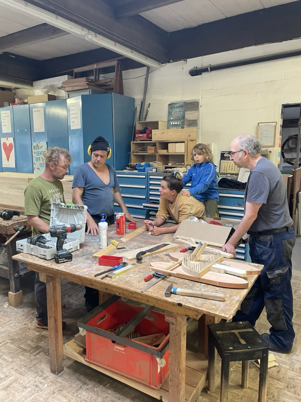 Die Sargwerkstatt findet weiterhin jeden Montag in der Quartierwerkstatt im Tscharni statt: dort werden die Heitere Särge gezimmert, und Interessierte können mit unserer Begleitung ihren eigenen Sarg oder den für eine nahestehende Person bauen.