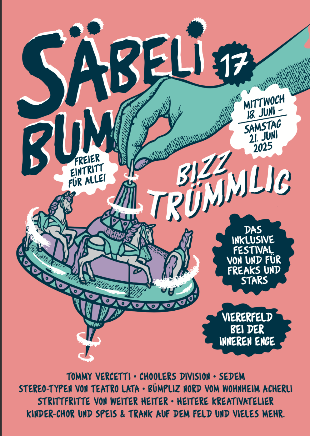 Zum 17. Mal findet vom 18. - 21. Juni 2025 das inklusive Säbeli Bum Festival statt. Es ist das Urprojekt des Kollektivs Frei_Raum und wird in diesem Jahr in einer Kooperation von Weiter Heiter & Heitere Fahne realisiert. Das Festival findet dieses Jahr auf dem Viererfeld statt.