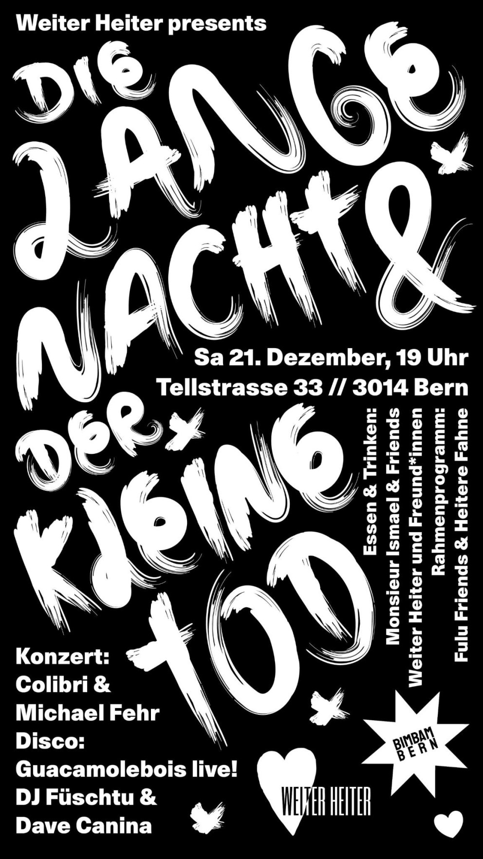 Für eine lange Nacht versuchen wir die Markuskirche zum Tanz zu erwecken. Mit leidenschaftlichen Klängen in der Kirche von Colibri, feinfühliger Poesie des Sprachkünstlers Michael Fehr, freudigem Klamauk der Fulu Friends, groovigen Techno mit den Guacamolebois aus Basel und den Beats von DJ Füschtu & Dave Canina. Mit dabei die Freund*innen aus heiterem Haus: Leila, Jerry und DJ Stechloff bereichern den Abend mit Gesang und Sounds. Dazu Speis und Trank von Monsieur Ismael & Friends.…und der kleine Tod - der versteckt sich doch überall - ihr dürft also gespannt sein!